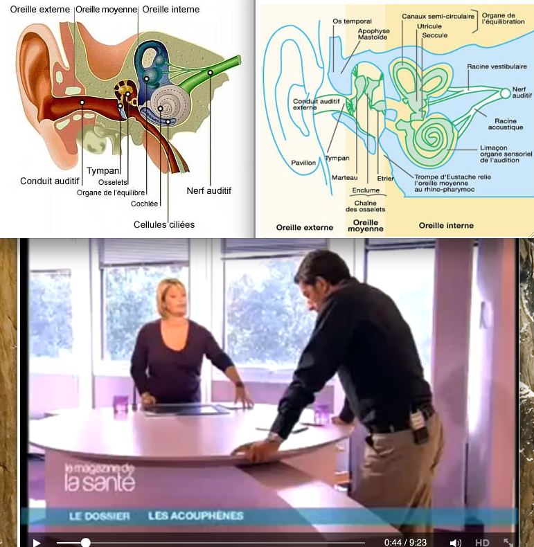 Si j'arrive à me faire entendre, on pourra dire que l'acouphène prend naissance dans le système auditif. La destruction des cellules ciliées dans l'oreille interne en est la cause principale (ou la dégénérescence des cellules ciliées. Ce problème secondaire est liée à l' âge).